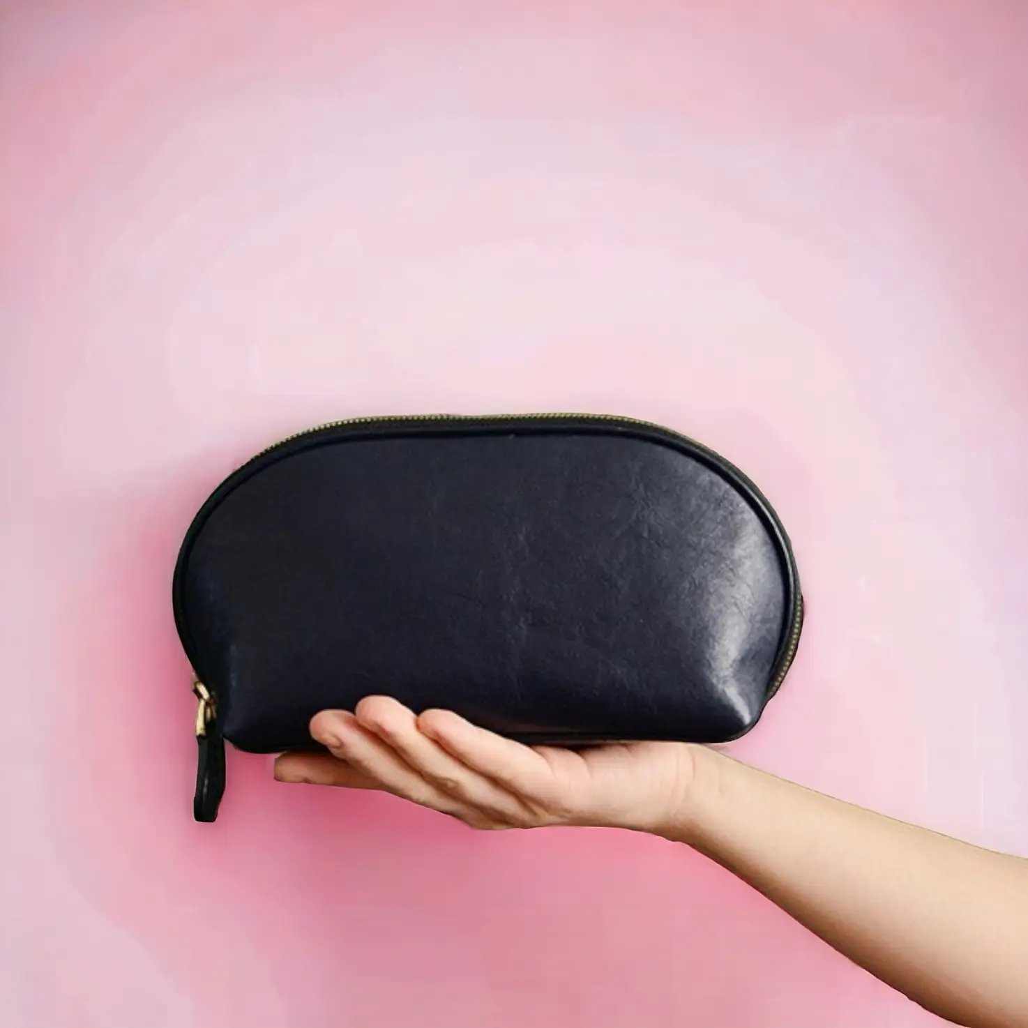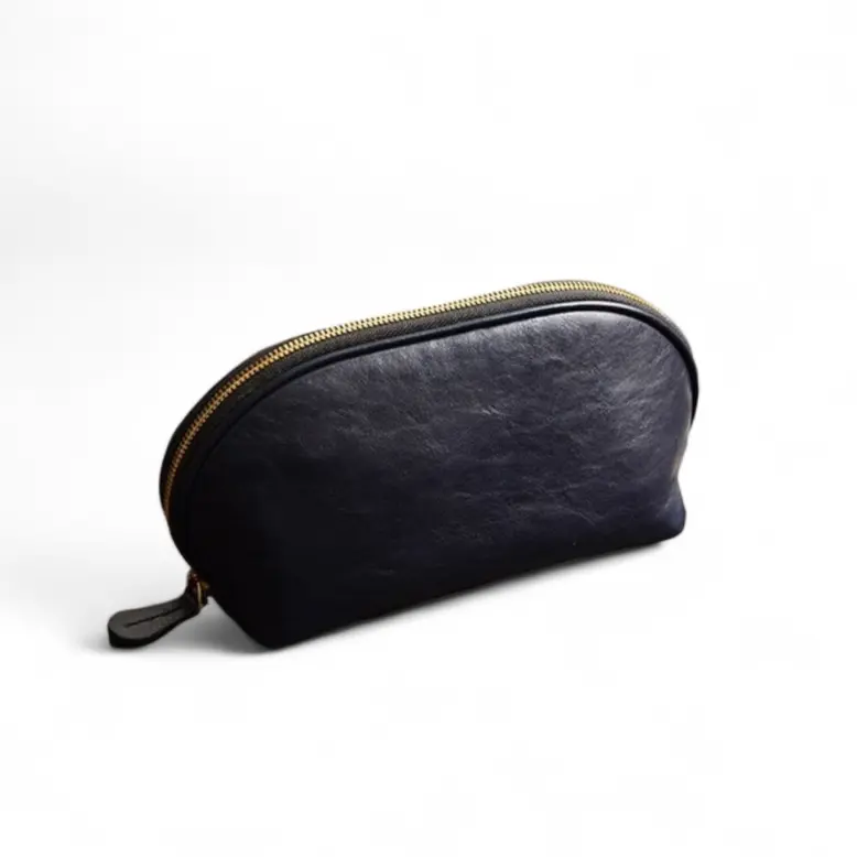 Stylish and practical leather cosmetic bag for makeup essentials on the go. Spacious interior and sleek design.